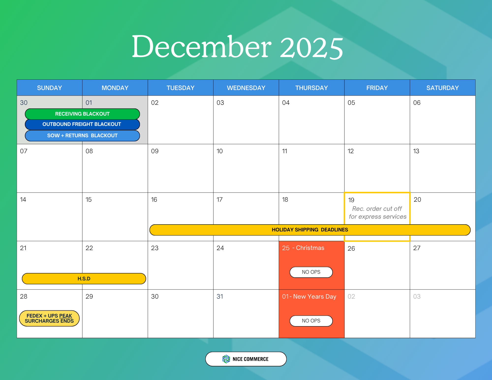 - Cut off your "express" shipping options by 12 pm Friday, December 19th. Nice Commerce does not ship orders out on weekends.